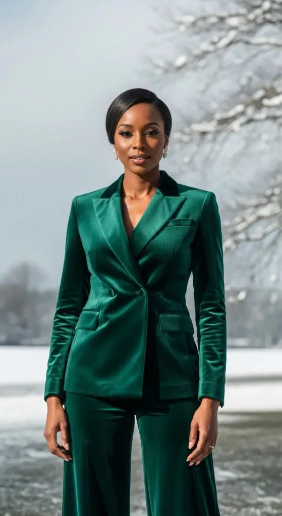 A velvet suit in emerald, sapphire, or purple creates a luxurious, bold moment. It’s perfect for women who want a fashion-forward holiday outfit.