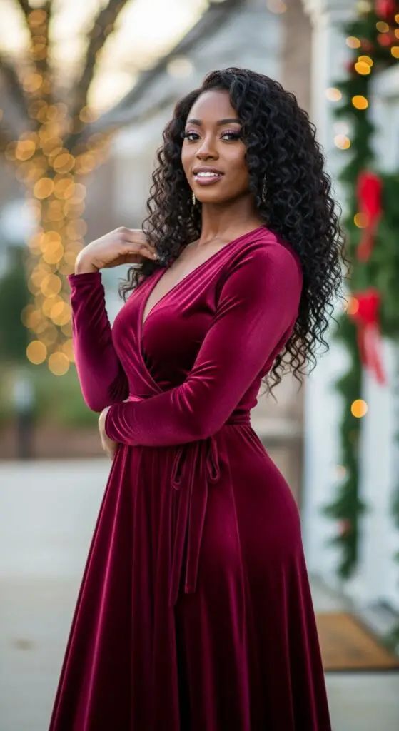 A burgundy velvet wrap dress adds warmth and richness to your holiday wardrobe. The wrap silhouette flatters curves while the color glows against deeper skin tones.