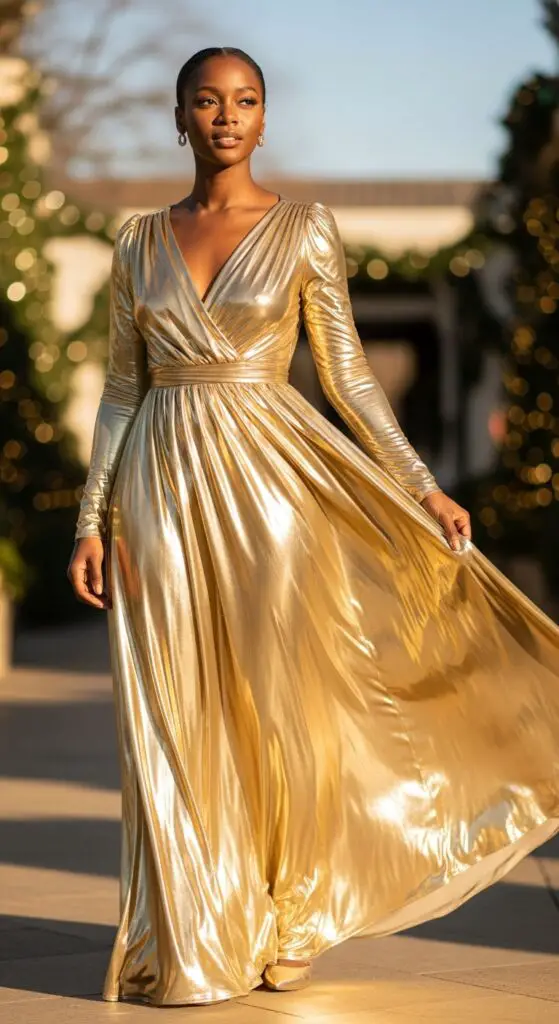Gold metallic fabric gives a radiant, luxurious shine. A flowy maxi dress offers dramatic movement and looks stunning in Christmas photos.