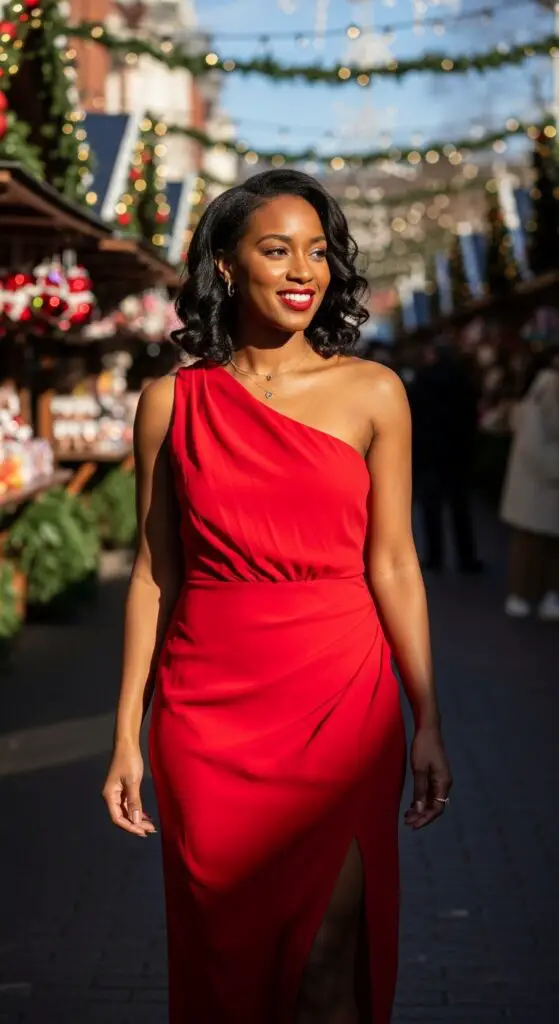 A red one-shoulder midi dress is vibrant, classy, and festive. The asymmetric design adds visual interest while keeping the look polished.
