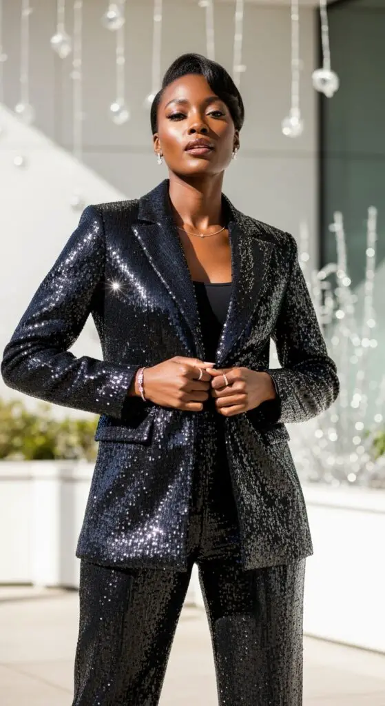 A black sequin blazer set is sleek and powerful. Wear it with a simple cami to create a stunning holiday party statement look.