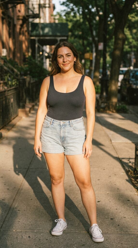 A fitted bodysuit with denim shorts gives a clean and streamlined silhouette. This outfit is perfect when you want something simple yet put-together. Pair with sneakers for daytime or dress it up with heeled sandals and statement accessories.