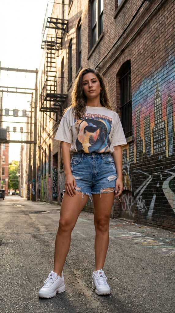 For a cool, laid-back outfit, style distressed denim shorts with a bold graphic tee. Tuck in the front slightly and add sneakers or combat boots for an edgy touch. This look is perfect for casual hangouts and adds personality to your everyday style.