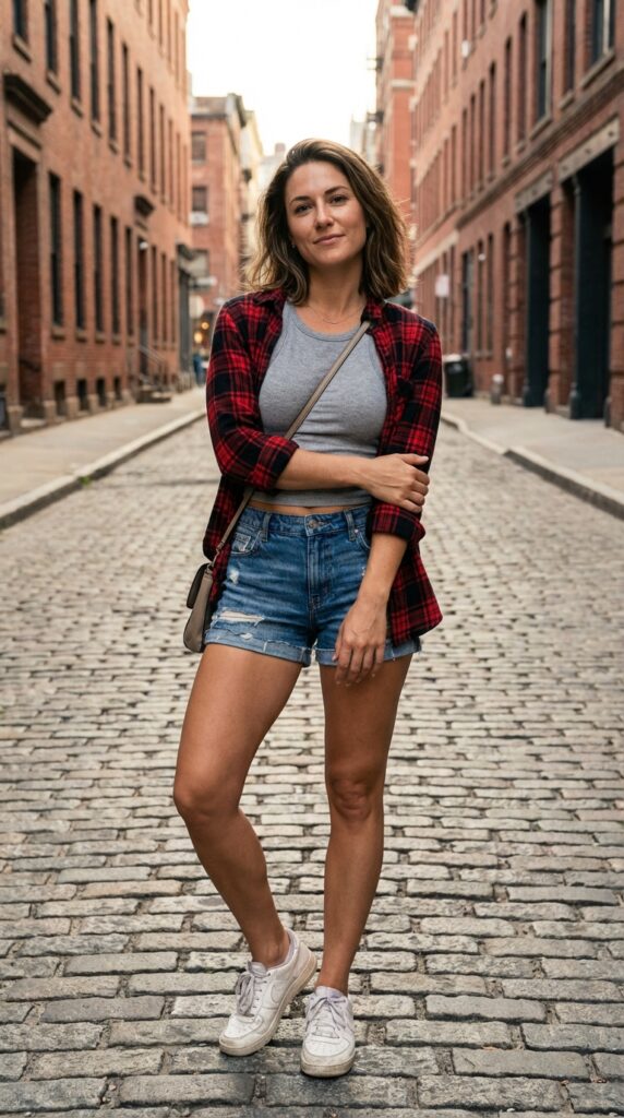 Layer a lightweight flannel over a basic tank top and denim shorts for a relaxed, slightly edgy look. Tie the shirt at the waist or leave it open for a laid-back feel. Complete the outfit with sneakers or ankle boots for an easy everyday style.