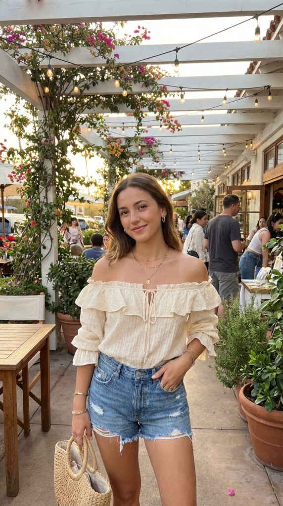 An off-shoulder top paired with denim shorts creates a soft, feminine summer outfit. The neckline adds a flirty touch while keeping things breezy. Style it with delicate jewelry, sandals, and a woven bag for a romantic daytime look.