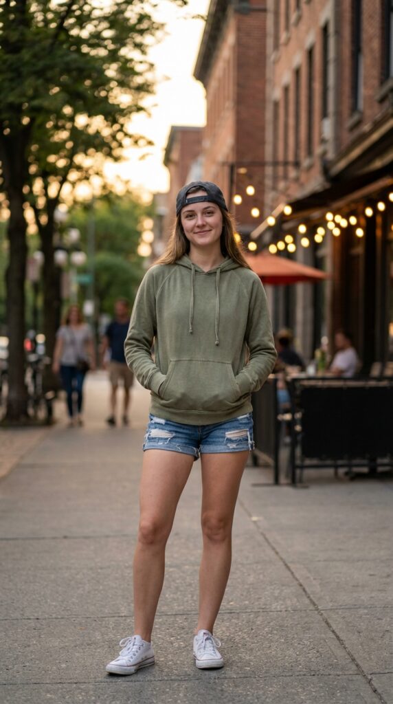 For cooler summer evenings, style denim shorts with a lightweight hoodie. This cozy yet stylish combination is perfect for casual outings. Pair with sneakers and a baseball cap for a sporty, relaxed look that still feels trendy.