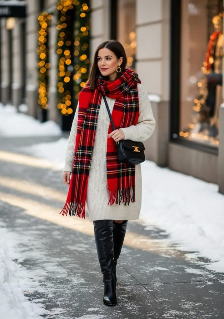 A cozy knit dress layered with a bold plaid scarf creates the perfect New York In December Outfits vibe.