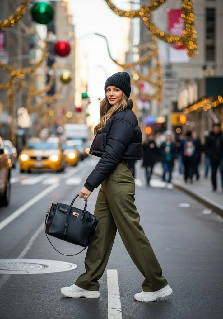A modern case of Nyc Winter Fits featuring a cropped puffer and tailored wide-leg trousers.