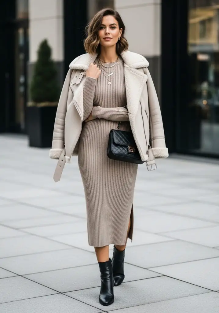 9. Shearling Jacket & Ribbed Midi Dress