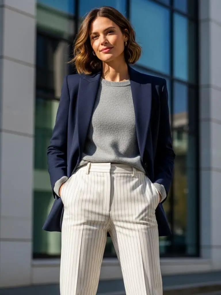 Layer a structured blazer over a fitted sweater and straight-leg pants for a trendy work outfit that still feels classic. This smart casual work outfit keeps you warm without losing corporate polish.