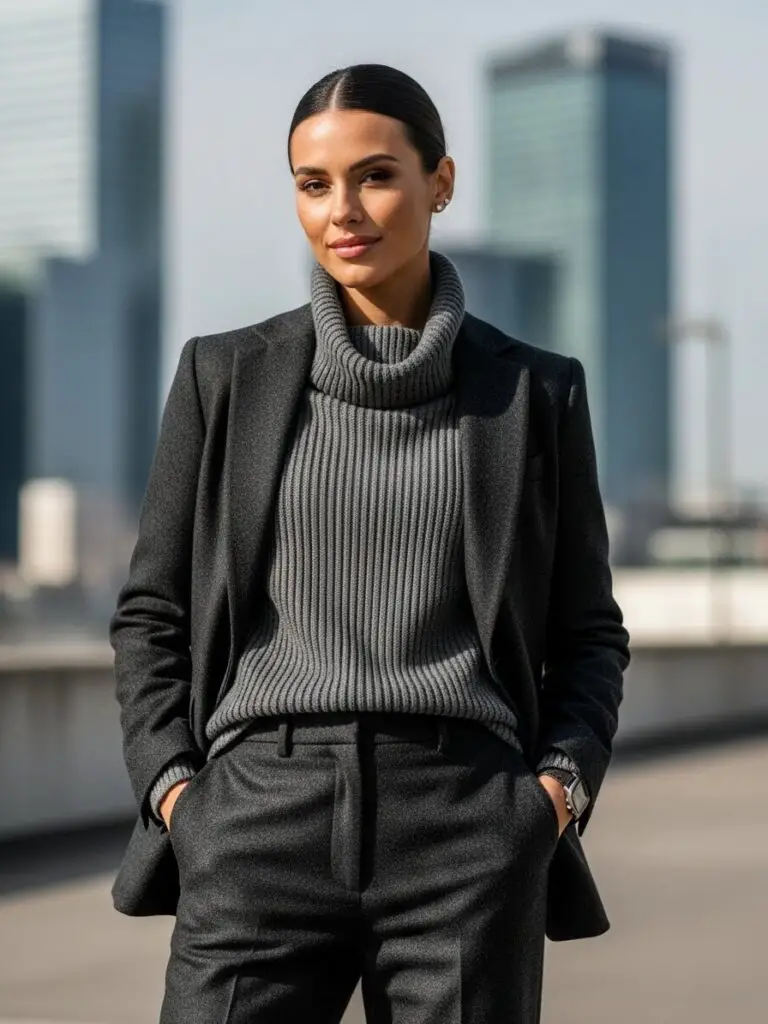 A monochrome tailored suit in black, gray, or cream creates a powerful corporate baddie look. Add a turtleneck underneath for extra warmth while keeping the silhouette sharp and chic.
