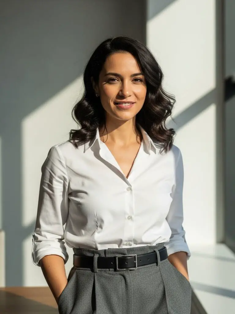 A crisp button-up shirt tucked into high-quality wool trousers creates a smart casual work outfit for women who want classic winter polish. Add a structured belt to elevate the silhouette.