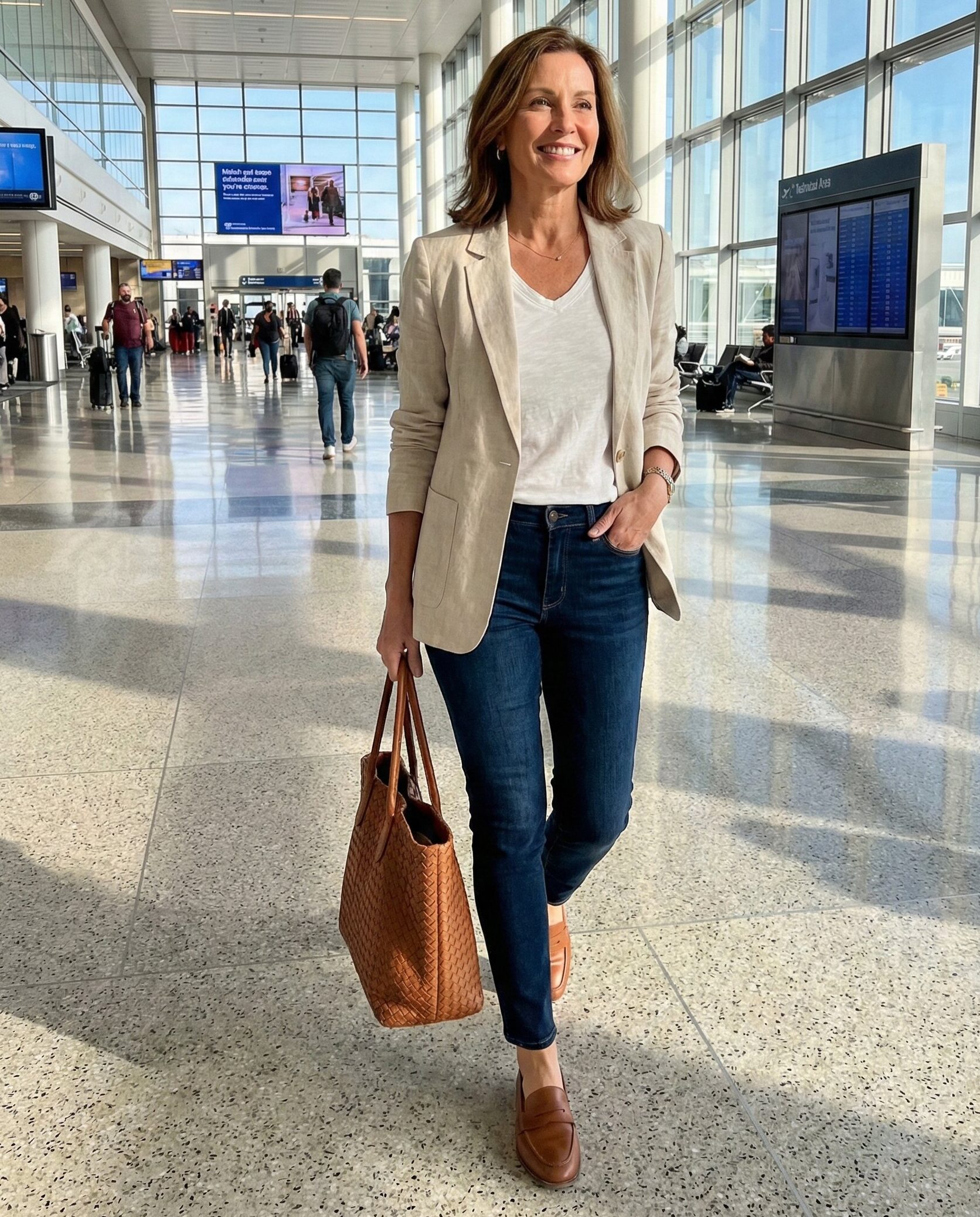 Stretch denim jeans combined with a breathable blazer balance comfort and structure. Choose a relaxed-fit tee underneath for layering flexibility. Slip-on loafers or cushioned sneakers complete this smart-casual airport ensemble.