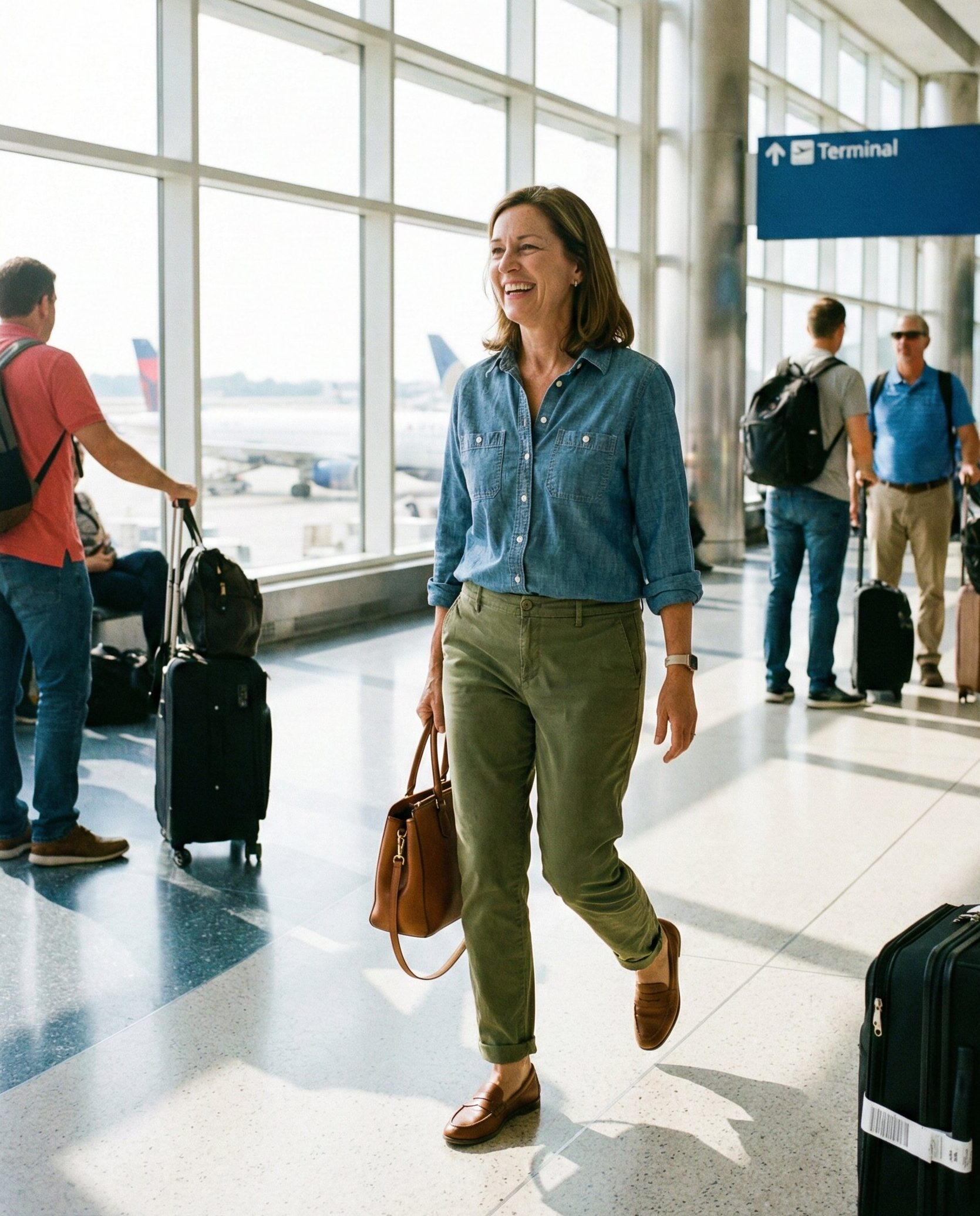 Relaxed-fit chinos paired with a chambray shirt create a casual yet polished travel outfit. Roll up the sleeves for a laid-back vibe. Comfortable loafers and a structured handbag tie everything together beautifully.