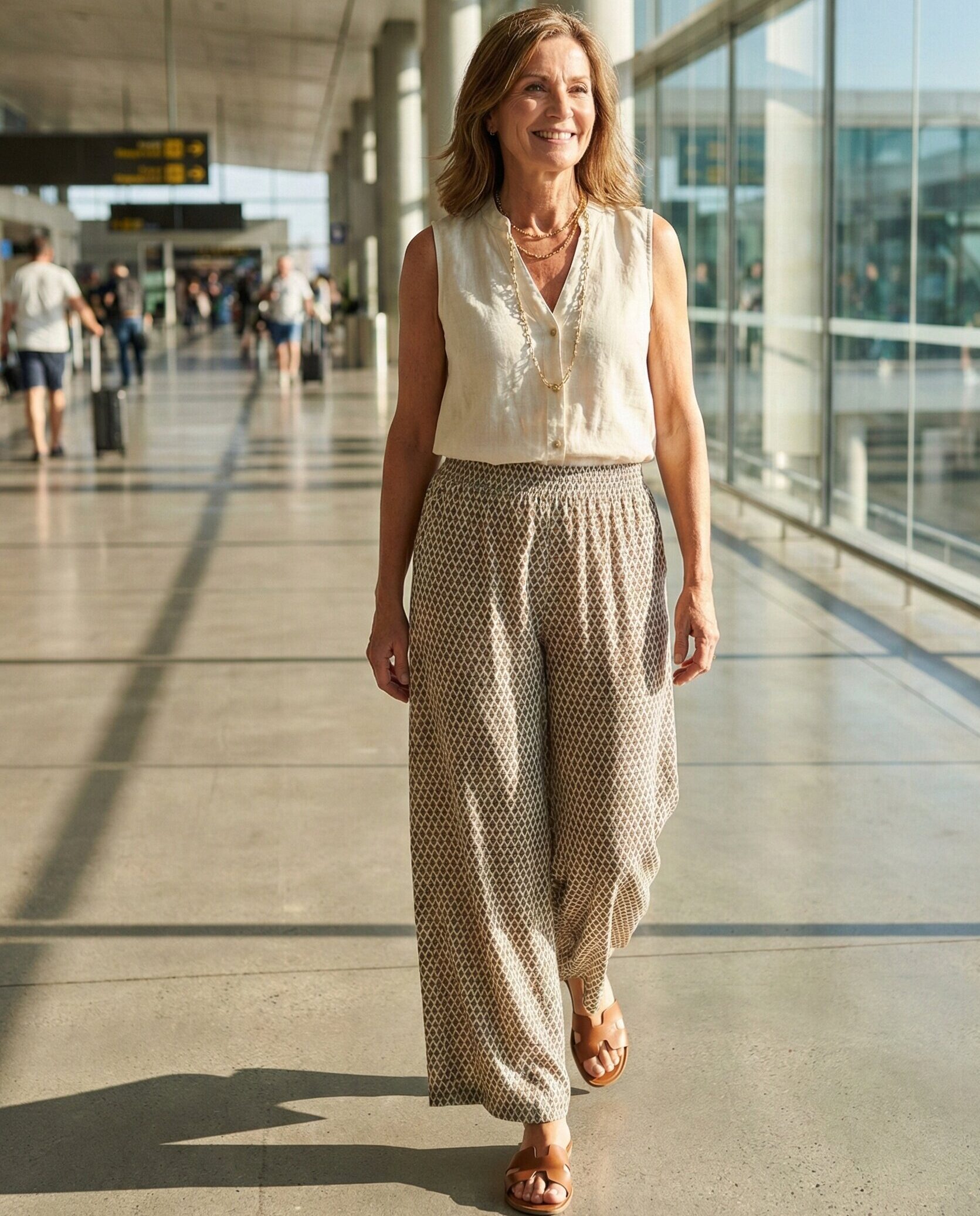 Palazzo pants offer airflow and comfort during warm-weather travel. Pair them with a modest sleeveless blouse for a graceful silhouette. Add layered necklaces and comfortable sandals for a relaxed yet refined airport look.