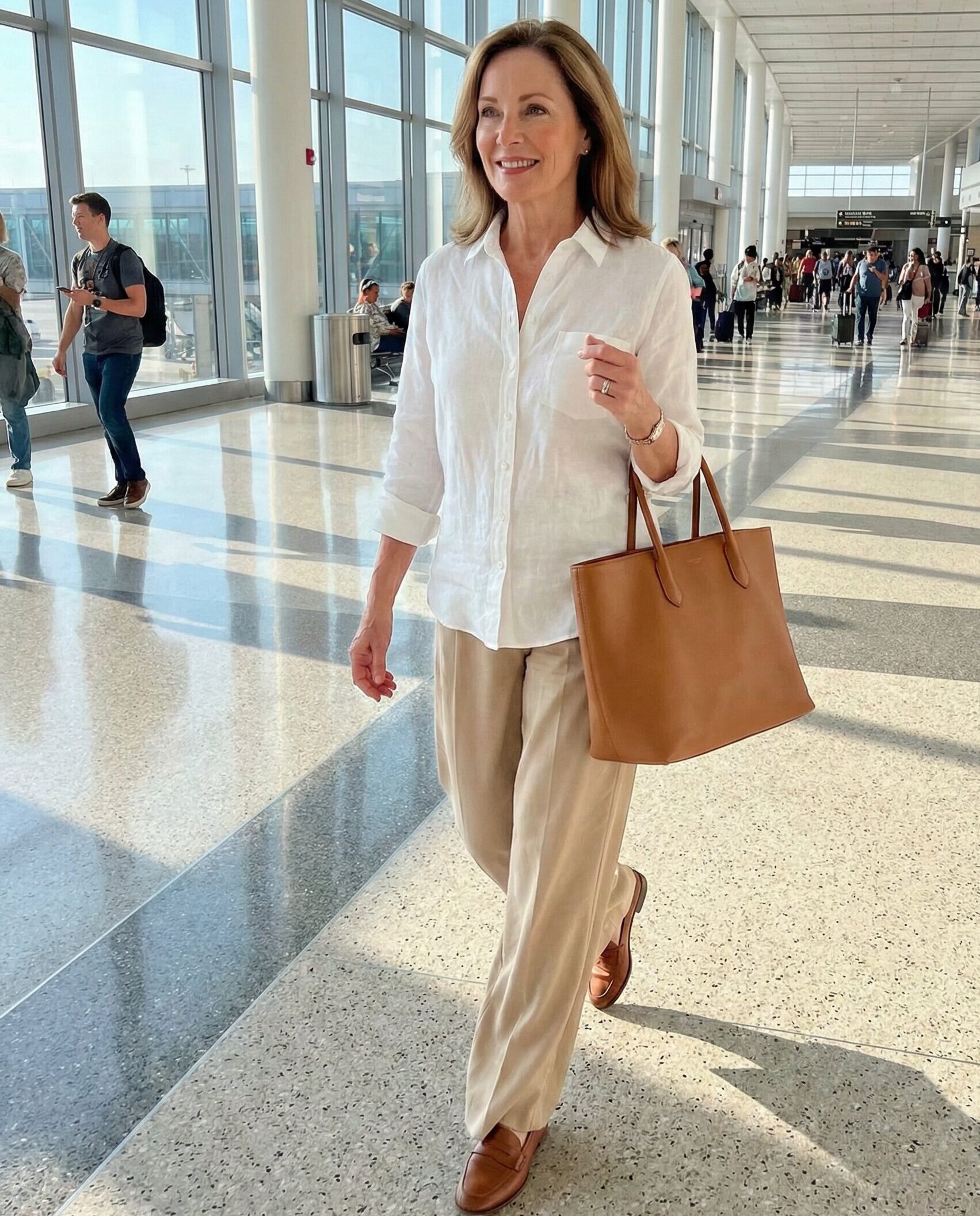 A crisp linen button-down paired with flowy wide-leg pants creates a breathable and refined airport look. Neutral tones feel timeless and sophisticated. Add comfortable loafers and a structured tote for a polished finish that keeps you cool and stylish during long travel days.