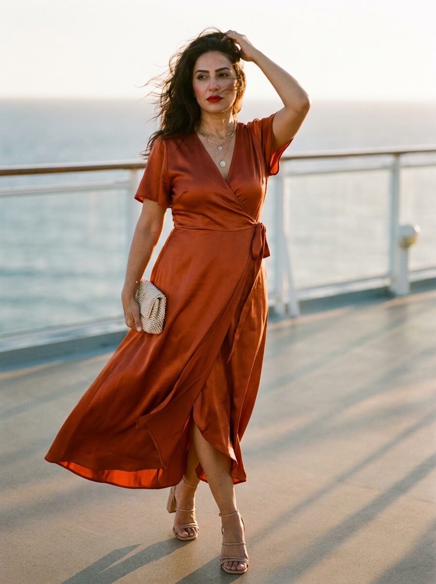 A satin wrap dress in burnt orange catches golden hour light perfectly. Pair it with strappy heeled sandals and a small clutch. A delicate layered necklace and bold lip color bring just enough drama for an evening at sea.