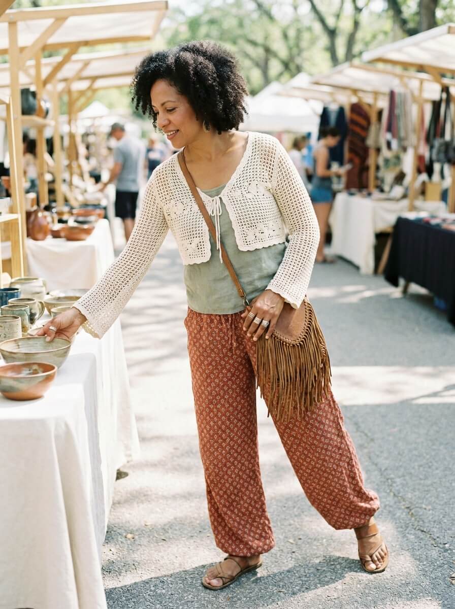 A crochet cropped cardigan layered over a loose linen tank adds texture without heaviness. Pair with printed wide-leg pants and flat leather sandals. A fringed crossbody and stacked rings complete this relaxed, slightly artistic look.