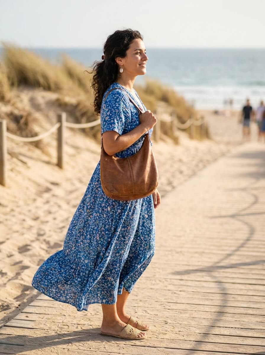 A flowy floral maxi dress with soft blue tones moves beautifully in ocean air. Flat lace-up sandals keep it relaxed, while a slouchy hobo bag adds ease. Finish with shell earrings for a quiet nod to the setting.