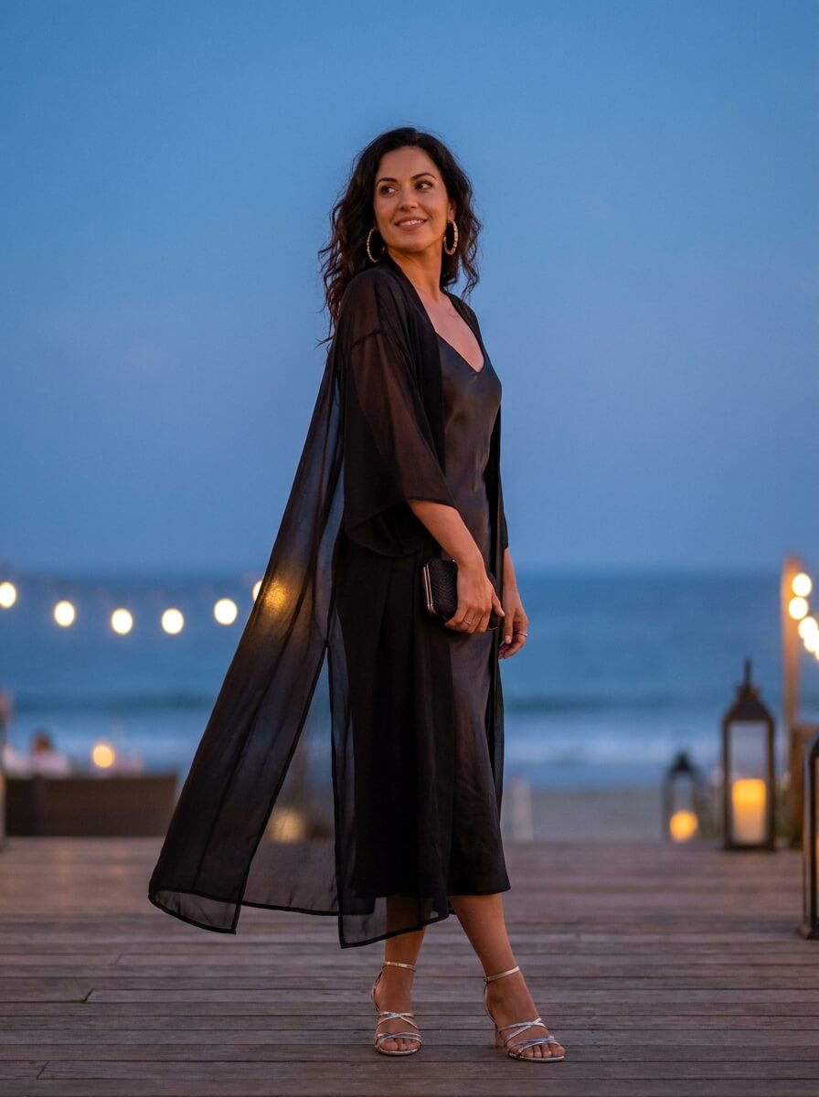 A sheer black kimono layered over a fitted slip dress adds movement and intrigue. Pair with strappy metallic heels and a sleek clutch. Finish with statement earrings for a bold yet ageless night look.