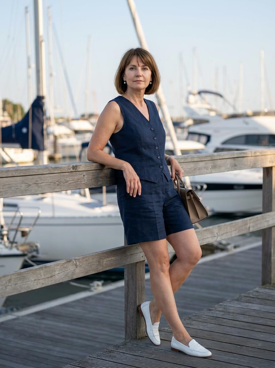A sleeveless navy vest worn as a top with matching tailored shorts creates a sharp, modern set. White loafers add a preppy twist. Carry a structured handbag and add pearl studs for a refined daytime outfit.