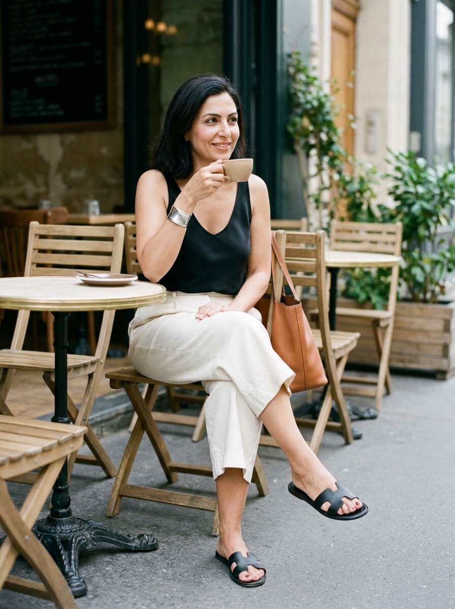 A crisp black tank paired with high-rise cream culottes feels clean and modern. Black slide sandals maintain the minimal vibe. Add a sleek leather tote and a simple cuff bracelet for understated elegance during casual stops.