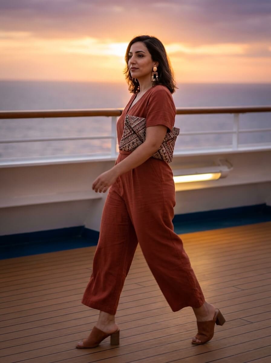 A rust-toned wide-leg jumpsuit with a cinched waist offers instant polish. Pair with block-heel mules and a clutch. Bold geometric earrings bring personality, making this ideal for evening cocktails without overthinking.