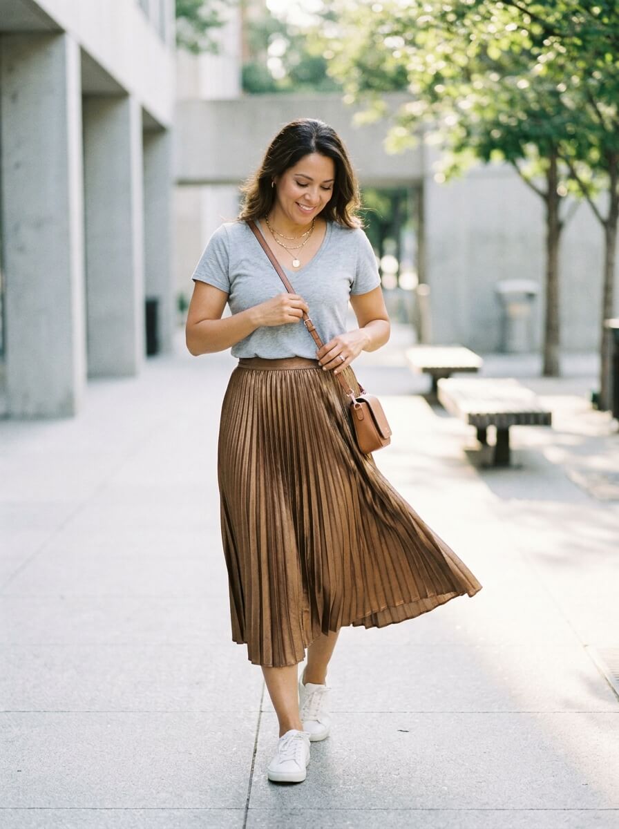 A soft grey tee half-tucked into a pleated metallic midi skirt balances comfort and shine. White low-profile sneakers keep it wearable. Add a mini shoulder bag and layered chains for a modern, off-duty vibe.