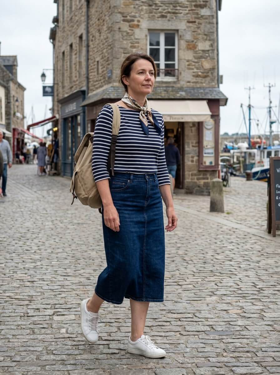 A striped boatneck top tucked into a dark-wash midi denim skirt creates a timeless base. White leather sneakers keep it practical for walking. Add a canvas backpack and a silk neck scarf for a slightly Parisian, travel-ready twist.