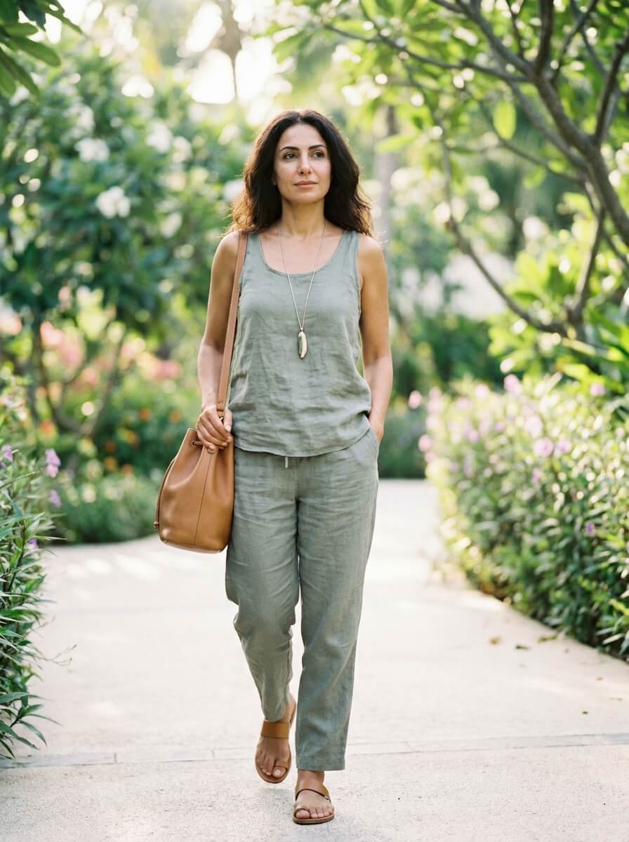 A lightweight sage linen tank paired with matching relaxed trousers creates a tonal look. Add minimalist leather sandals and a soft bucket bag. A long pendant necklace adds vertical interest without heaviness.