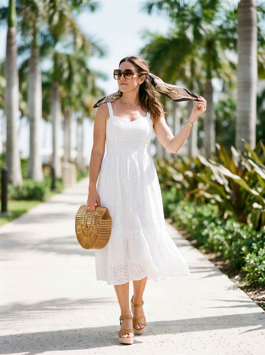 A white eyelet midi dress feels fresh and breathable under the sun. Pair with tan platform sandals and a bamboo top-handle bag. Add oversized sunglasses and a silk hair scarf for a polished resort aesthetic.