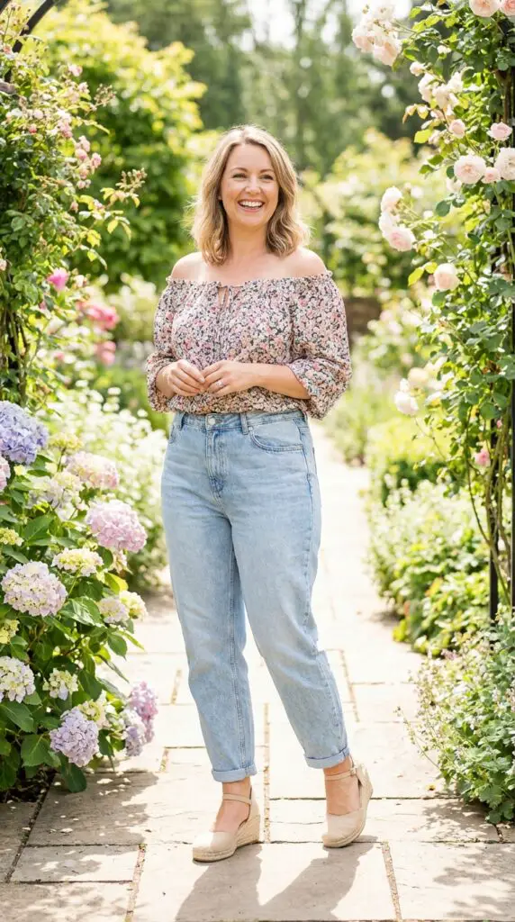 An off-shoulder top paired with relaxed mom jeans creates a playful and stylish summer combination. The exposed neckline adds a feminine touch while the loose denim keeps the outfit comfortable. Finish the look with espadrilles and delicate jewelry for a soft summer aesthetic.
