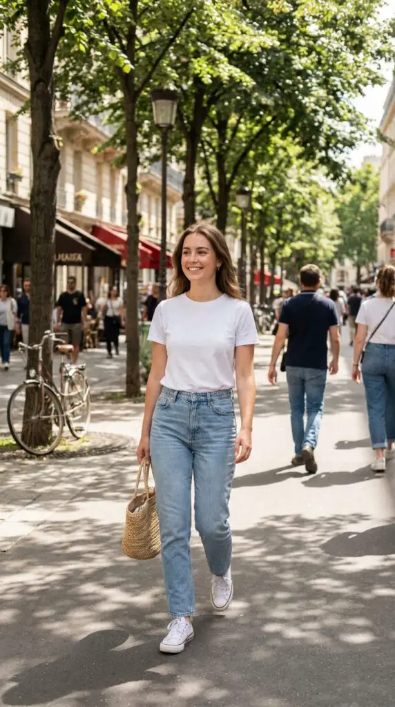 A classic white t-shirt paired with light wash jeans is one of the easiest summer outfits you can wear. The clean and minimal combination feels fresh and comfortable for warm days. Add white sneakers and simple sunglasses to keep the look relaxed, timeless, and effortlessly stylish.
