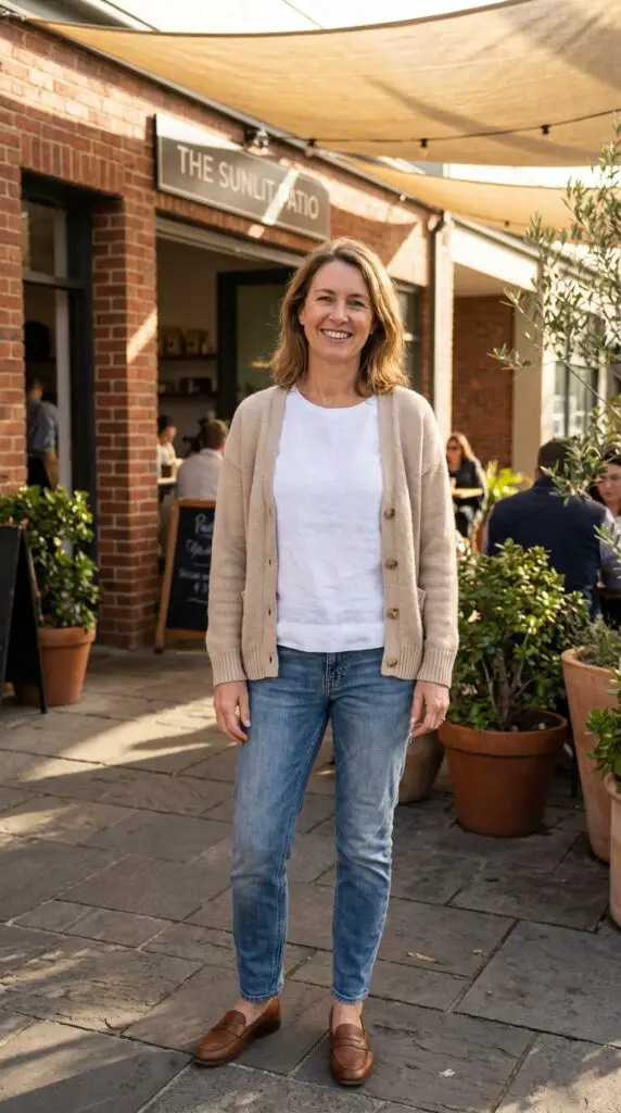 For slightly cooler summer evenings, a lightweight cardigan layered over a simple top and jeans works perfectly. The soft layer adds comfort without feeling heavy. Pair the outfit with loafers or flats and a small handbag for a cozy yet polished look.