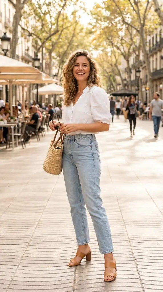 A puff sleeve blouse adds a stylish statement when paired with simple straight-leg jeans. The volume of the sleeves creates contrast against the structured denim. Complete the outfit with heeled sandals or flats and minimal jewelry for a chic summer look.