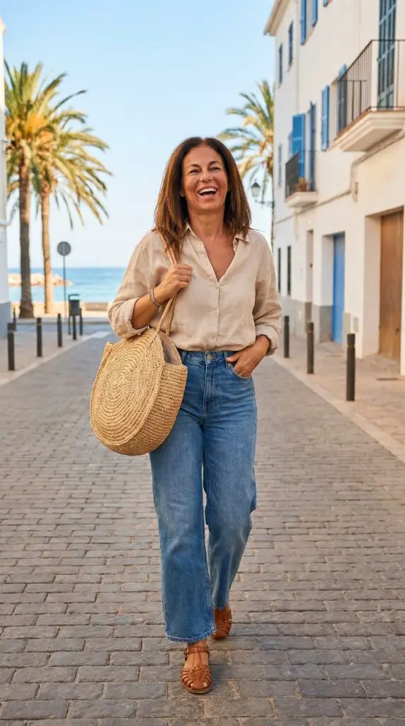 A breathable linen blouse looks effortlessly elegant when paired with wide-leg jeans. The loose silhouette keeps the outfit comfortable during warm days while still looking polished. Complete the look with woven sandals and a straw bag for a relaxed summer feel.