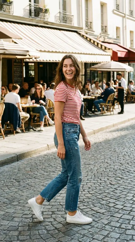 A classic striped t-shirt paired with blue jeans creates a timeless summer look inspired by casual French style. The pattern adds visual interest while the denim keeps the outfit grounded. Finish the look with white sneakers or ballet flats for effortless charm.