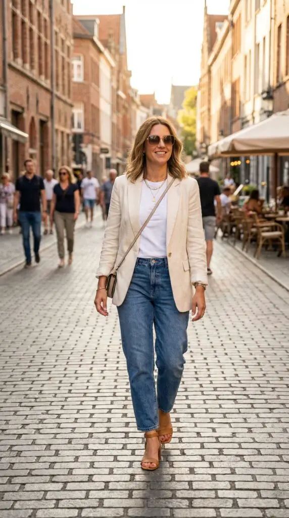 A lightweight blazer layered over a basic tee and jeans instantly elevates a casual outfit. This combination works perfectly for summer dinners or casual evenings out. Finish the look with loafers or heeled sandals and a structured handbag for a refined touch.