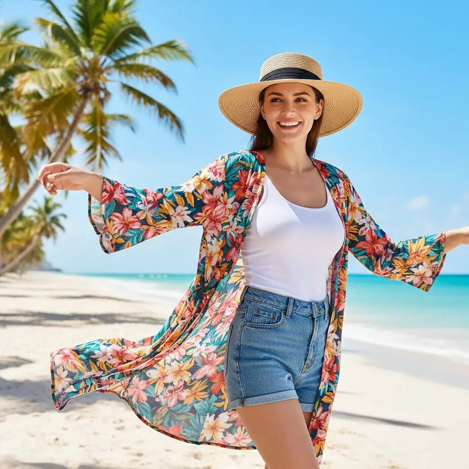 Layering a lightweight kimono over a basic tank and shorts instantly upgrades a simple look. The flowing layer adds movement and color, making it perfect for beach towns or resort areas. Finish with flat sandals and a straw hat.