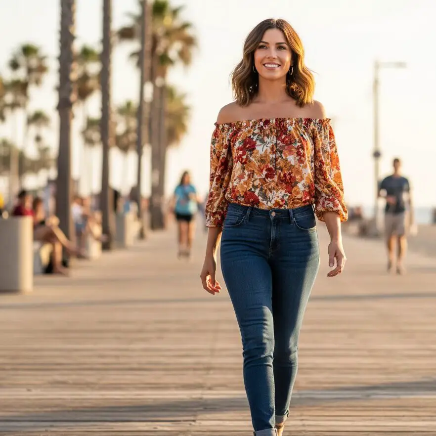 An off-shoulder top adds a feminine touch to classic skinny jeans. This outfit works well for cooler summer evenings or casual dinners. Pair with heeled sandals and subtle accessories for a balanced, stylish appearance.