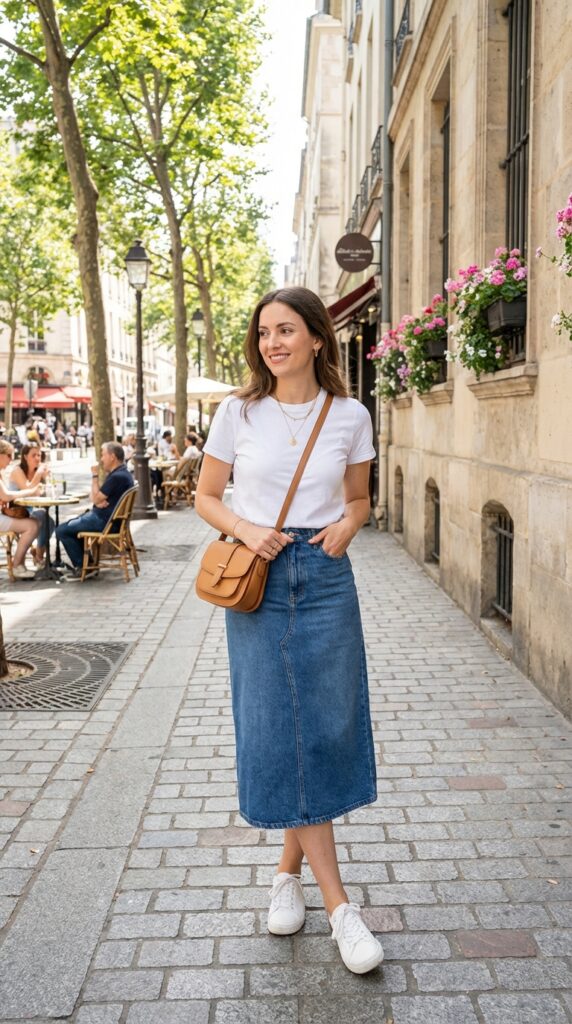 A crisp white fitted tee paired with a blue denim skirt outfit is the ultimate go-to. Add white sneakers, a tan crossbody bag, and minimal gold jewelry. This casual denim skirt outfit feels clean, fresh, and perfect for everyday errands or relaxed brunch plans.