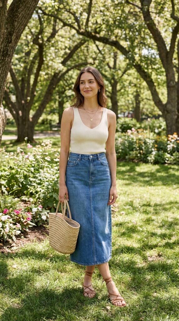 A fitted ribbed tank tucked into a high-waisted skirt creates a flattering silhouette. This jeans skirt outfit summer look pairs well with strappy sandals, a woven bag, and delicate jewelry for a clean and feminine finish.