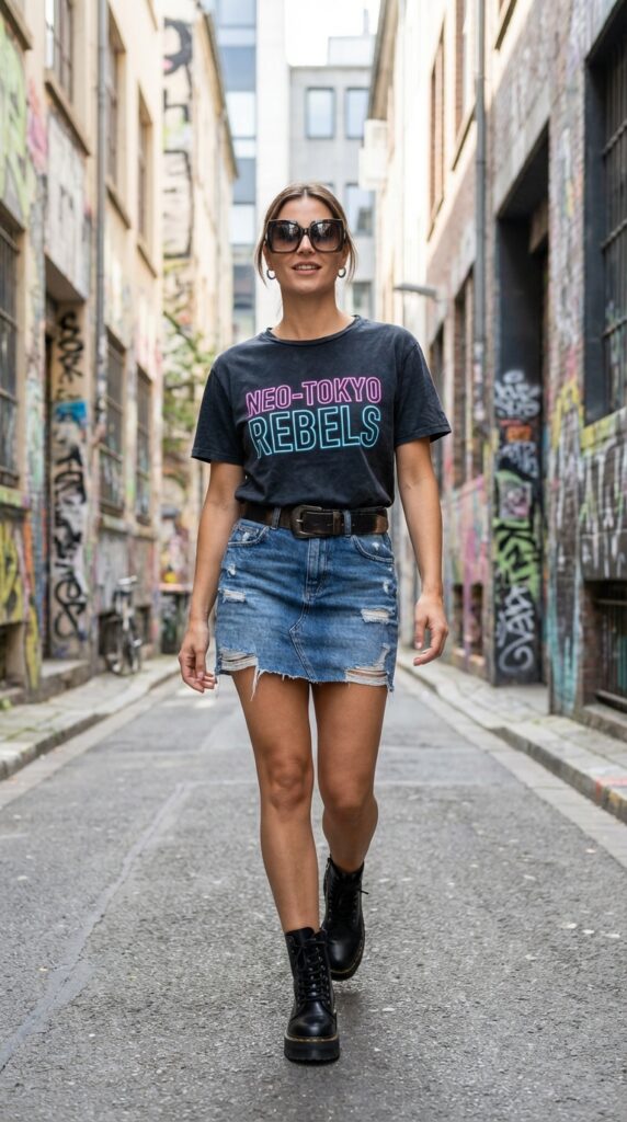 A bold graphic tee paired with a distressed skirt creates edgy denim skirt looks. Complete the outfit with combat boots, a belt, and statement sunglasses. This outfit is perfect for concerts, casual hangouts, or city walks.