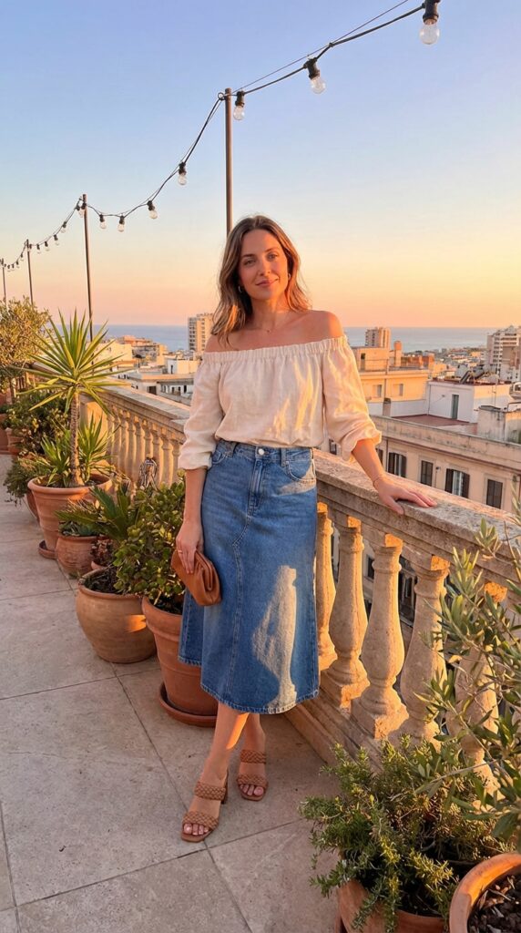 An off-shoulder blouse brings a soft, romantic touch to classic denim skirt fits. Pair with a mid-length skirt, heeled sandals, and a clutch. This look works perfectly for summer dinners or sunset outings.