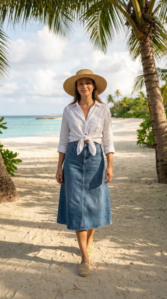 Lightweight linen shirts elevate your denim skirt outfit spring into summer. Knot the shirt at the waist and pair it with an A-line denim skirt. Add espadrilles and a straw hat for a breezy vacation-ready look.