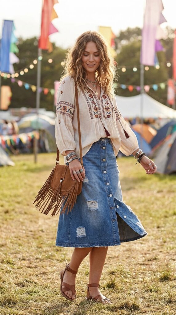 Flowy boho tops pair beautifully with button-front skirts. This relaxed casual denim skirt outfit is ideal for festivals or weekend strolls. Add sandals, layered jewelry, and a fringe bag for a free-spirited feel.