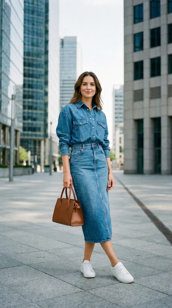 Try double denim by pairing a chambray or denim shirt with your skirt. Keep the shades slightly different for contrast. This bold how to style denim skirt idea works with white sneakers and a structured handbag.