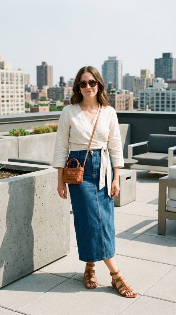 A lightweight knit top styled with a midi denim skirt creates a balanced look. This modern how to style denim skirt outfit pairs well with slides and a tote bag. Comfortable yet refined for day-to-day styling.