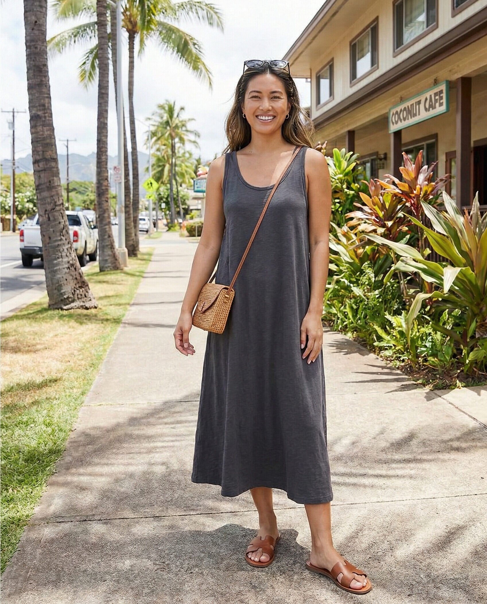 A simple tank dress is easy, comfortable, and perfect for hot island days. Choose breathable fabric and relaxed fits. Slide sandals and a crossbody bag complete this low-effort, high-style tropical look.