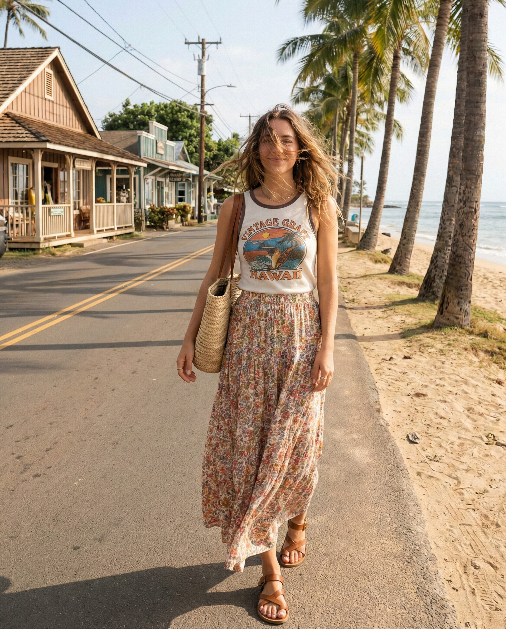 A graphic tank top paired with a flowy skirt adds personality to summer outfits. Lightweight fabrics move beautifully in the breeze. This look is playful, relaxed, and perfect for casual island activities.